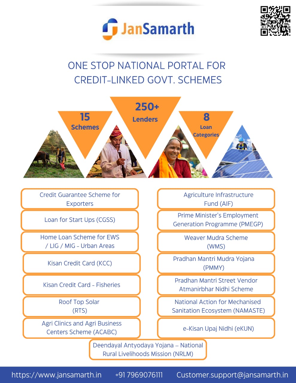 JanSamarth portal was launched by Hon’ble Prime Minister on 6th June'2022, conceptualized with the twin objectives of increasing the reach of the Government sponsored schemes and streamlining the credit delivery process for all the stakeholders, through a multitude of credit linked Government schemes. Since its launch, 15 credit-linked Central Government Schemes catering to diverse sectors like agriculture, renewable energy, business activity, livelihood, housing etc. are made available on the portal.